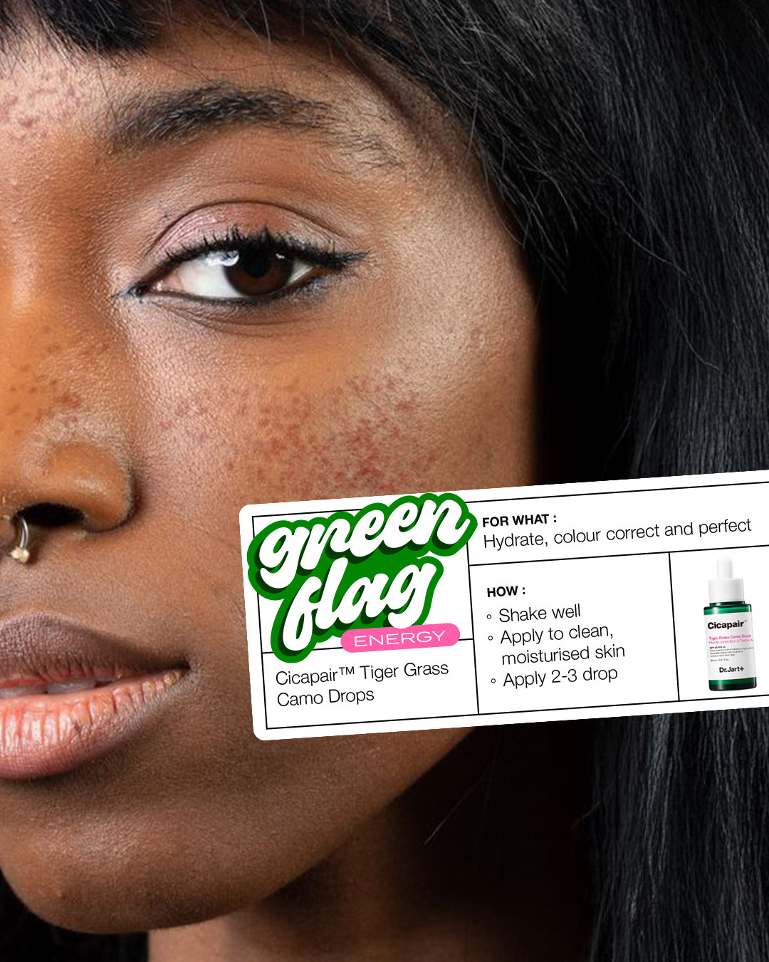 For the relaunch of their iconic Cicapair product, we created the Green Flag Energy campaign, playing on the idea that the product targets facial redness. To support the activation, we also designed a creative influencer seeding kit, including a mirror to admire the product’s soothing results and a keychain featuring the range’s playful mascot.